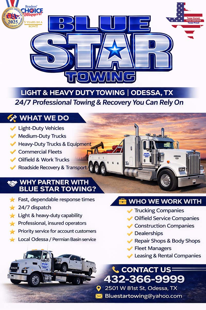 Drivers in the Odessa, Midland & Kermit, TX Area Trust Bluestar Towing